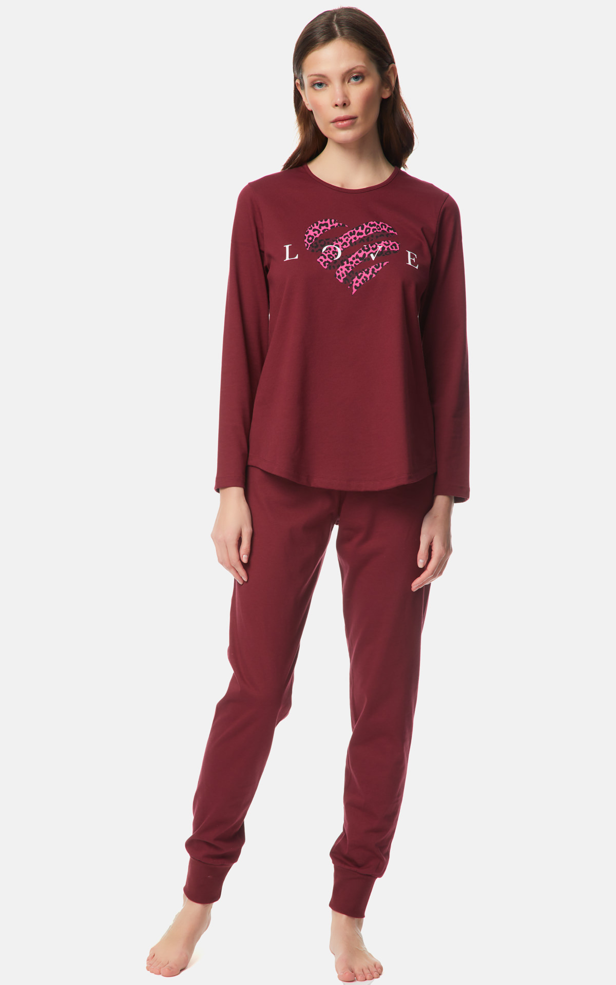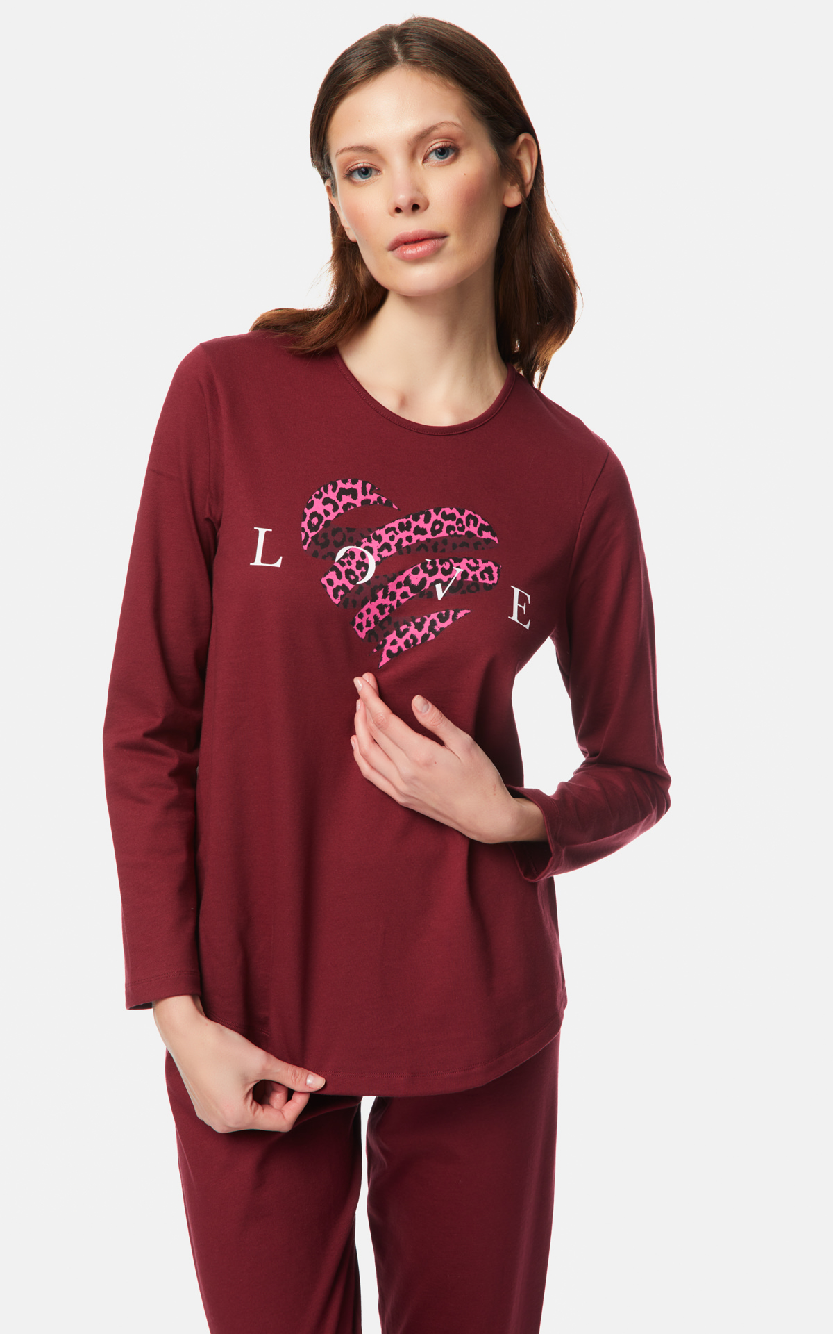 Γυναικεία χειμερινή πιτζάμα από 100% βαμβακερό ύφασμα υψηλής ποιότητας. Το σετ περιλαμβάνει μακρυμάνικη μπλούζα με στρογγυλή λαιμόκοψη και τύπωμα στο στήθος. Συνδυάζεται με μακρύ μονόχρωμο παντελόνι με μπάσκες στα τελειώματα.