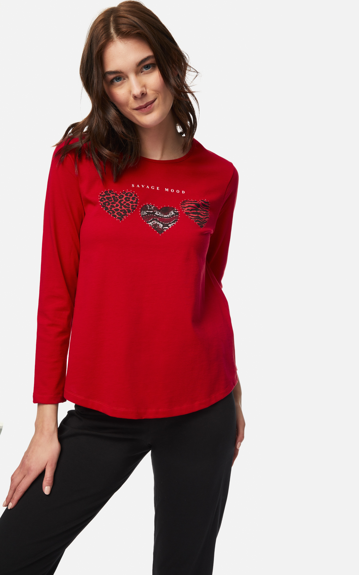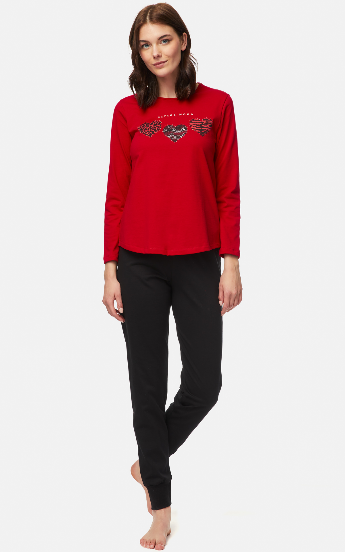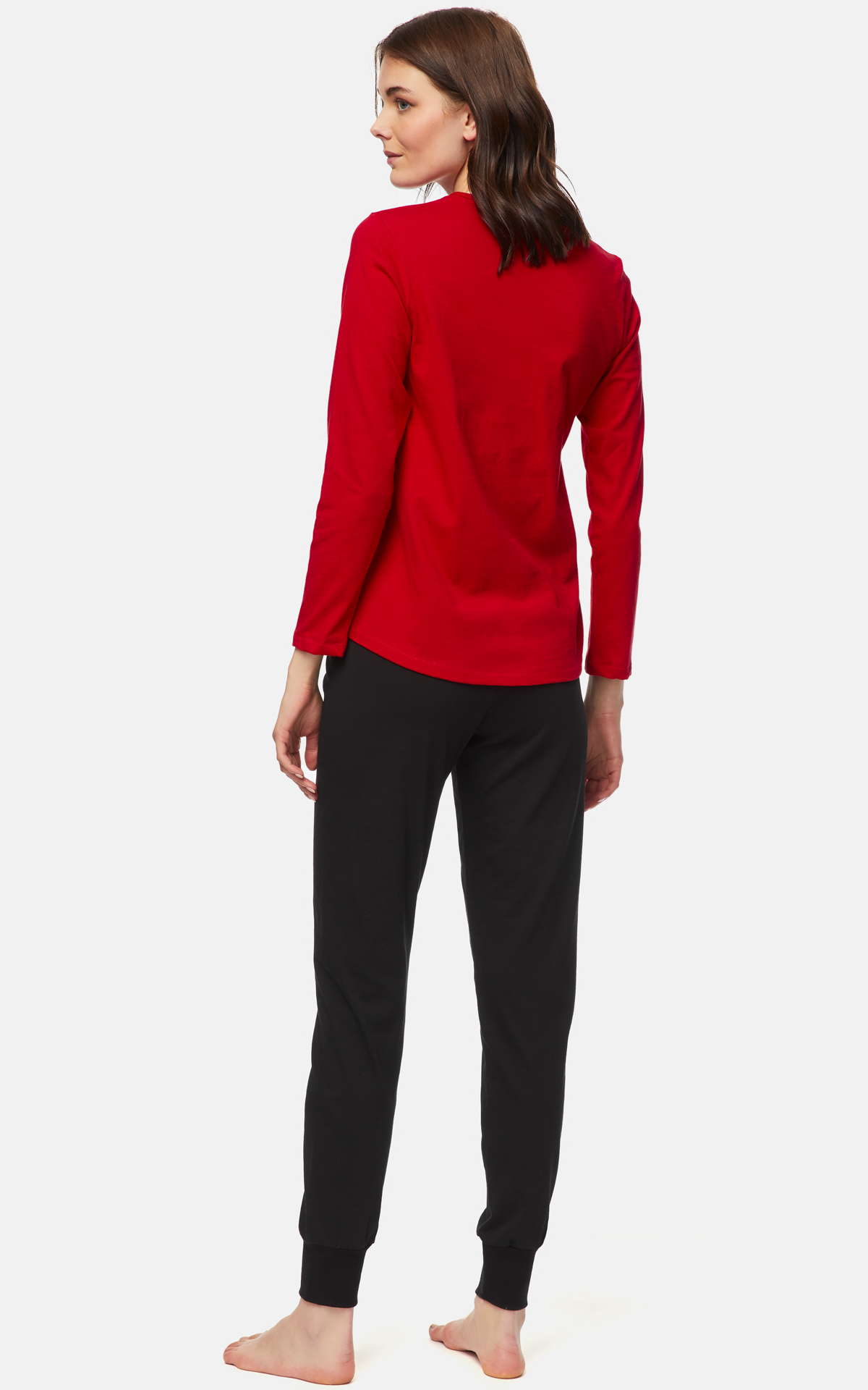 Γυναικεία χειμερινή πιτζάμα από 100% βαμβακερό ύφασμα υψηλής ποιότητας. Το σετ περιλαμβάνει μακρυμάνικη μπλούζα με στρογγυλή λαιμόκοψη και τύπωμα στο στήθος. Συνδυάζεται με μακρύ μονόχρωμο παντελόνι με μπάσκες στα τελειώματα.