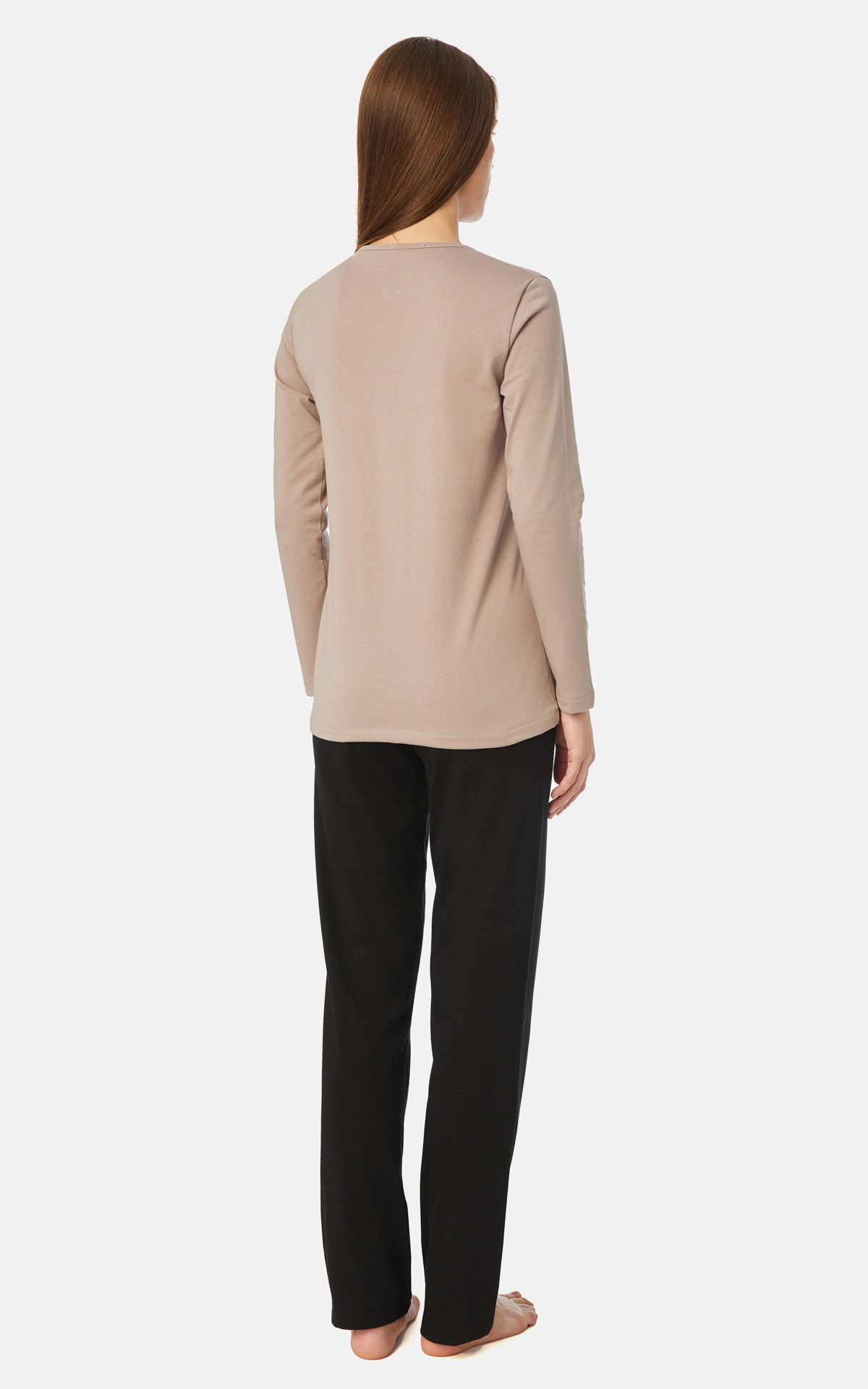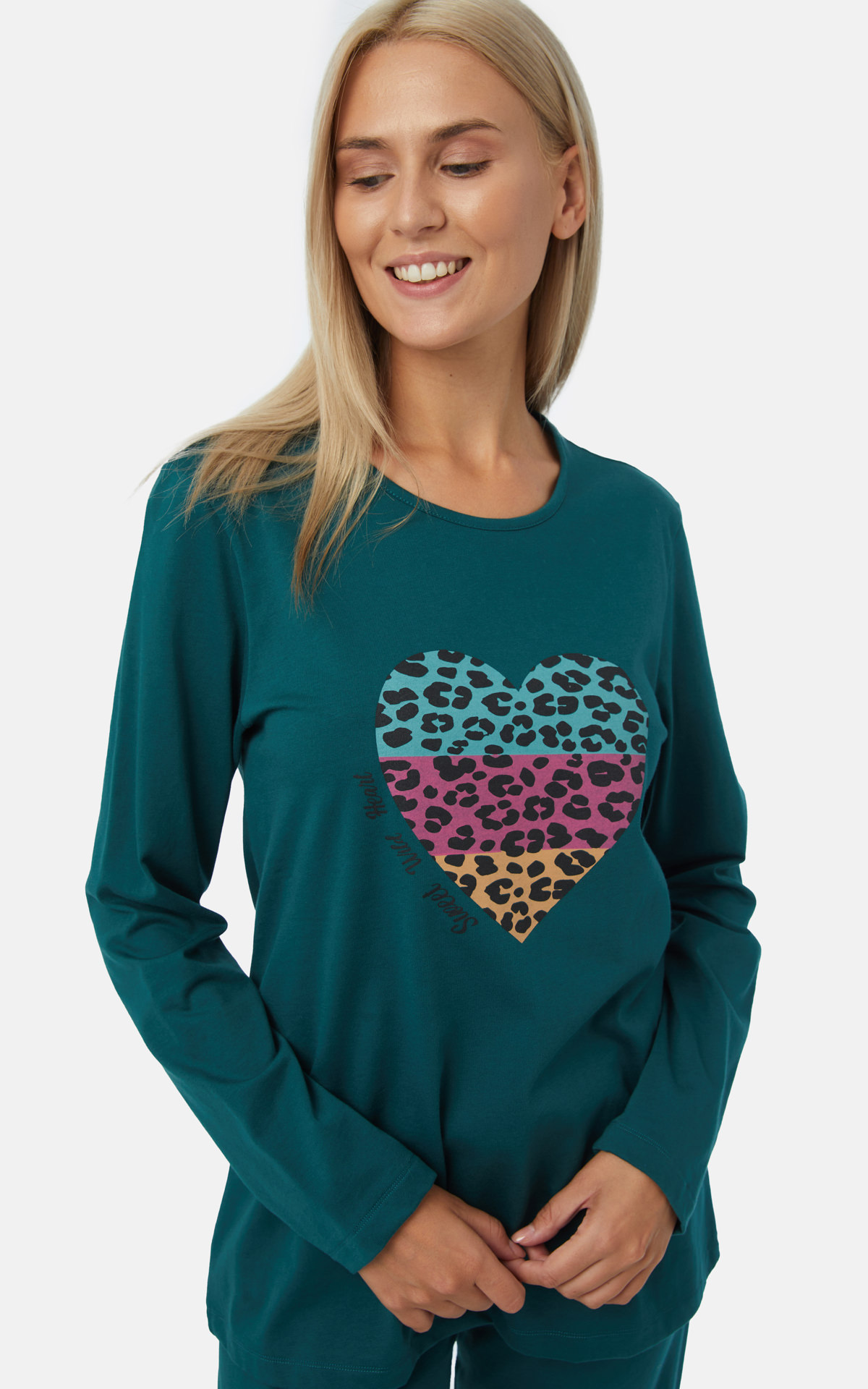 Γυναικεία χειμερινή πιζάμα από 100% βαμβακερό ύφασμα υψηλής ποιότητας. Το σετ περιλαμβάνει μακρυμάνικη μπλούζα με τύπωμα στο στήθος και μακρύ μονόχρωμο παντελόνι με μπάσκες στα τελειώματα.