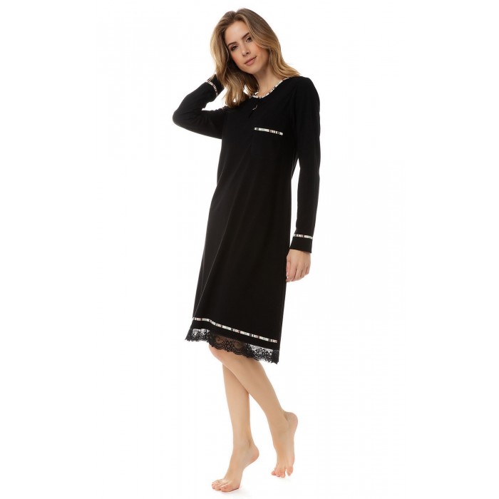 Γυναικεία χειμερινή νυχτικιά με μήκος ως το γόνατο από βαμβάκι εξαιρετικής ποιότητας και αντοχής και TENCEL™ Modal για μεταξένια αίσθηση. Με άνοιγμα και κουμπάκια στη λαιμόκοψη, τσέπη στο πλάι, διακοσμητικά ρέλια στο λαιμό, στη τσέπη, στα μανίκια και στον ποδόγυρο, καθώς και ρομαντική δαντέλα στον ποδόγυρο.